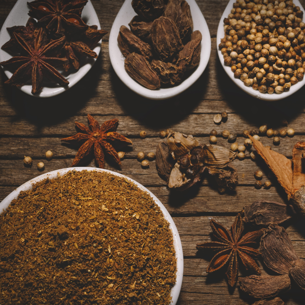 coriander, cumin, red chilli powder, cinnamon, bay leaves, pepper, cloves, black cardamom, green cardamom, star anise, nutmeg, fennel, turmeric, fenugreek seeds, fenugreek leaves, black stone flower.